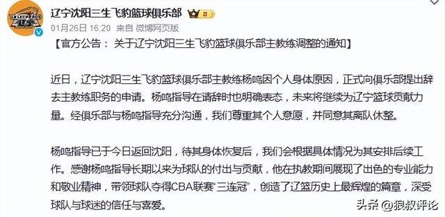 1月26日,辽宁男篮官方社媒发文,杨鸣正式卸任辽篮主帅的位置,对此,杨鸣表示:最近球队的表现真心对不住球迷们的支持,让大家很失望,我非常内疚和惭愧。